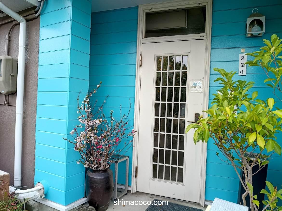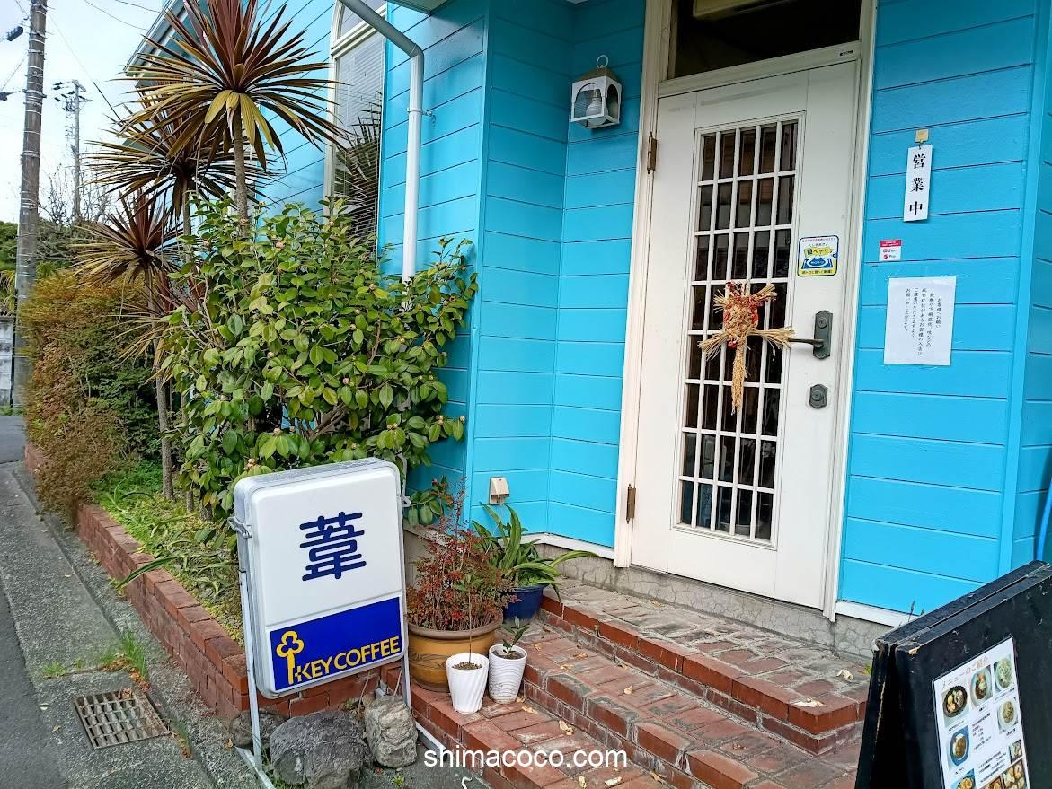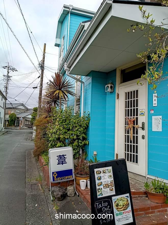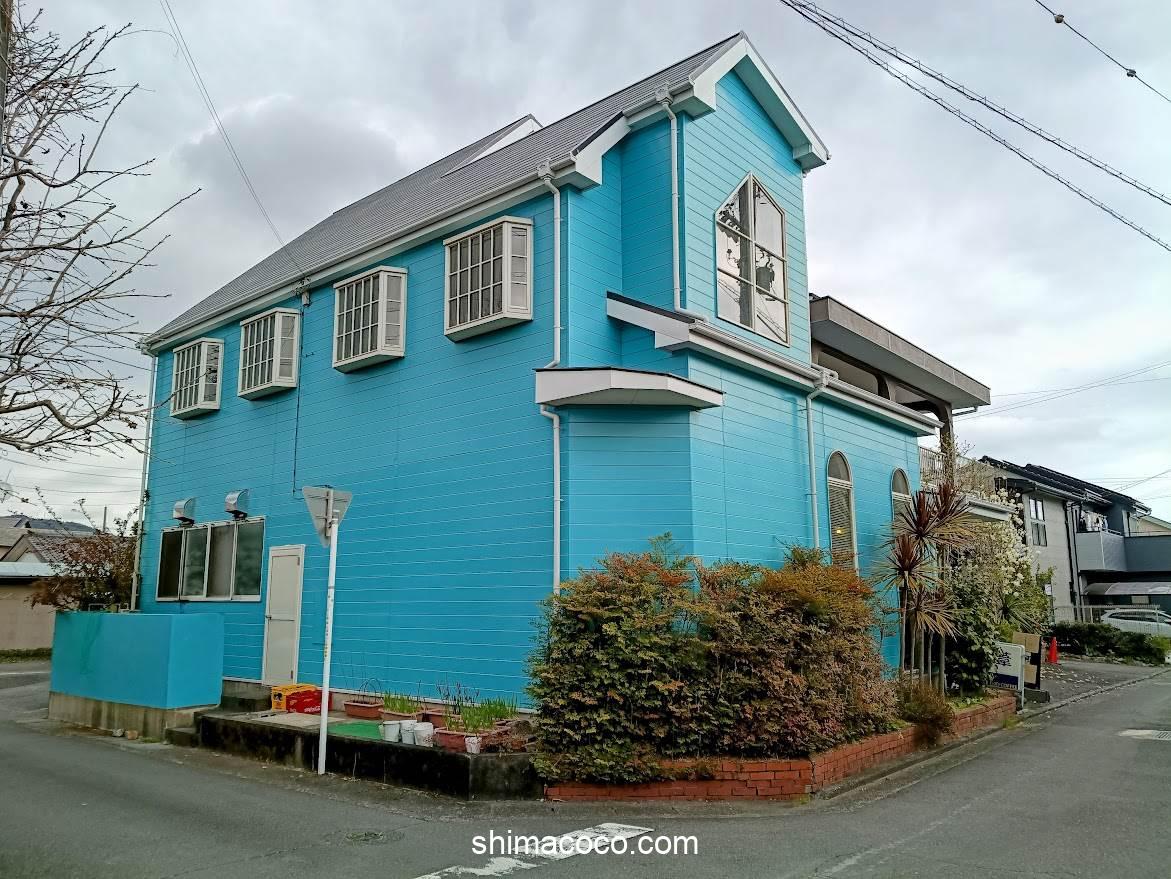 遠くからでも目立つ青い建物がおしゃれで可愛い