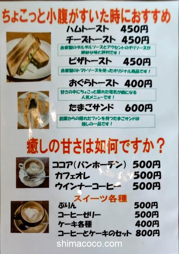 コーヒーやデザートはもちろん、サンドイッチやトーストといった軽食メニューも充実しています。