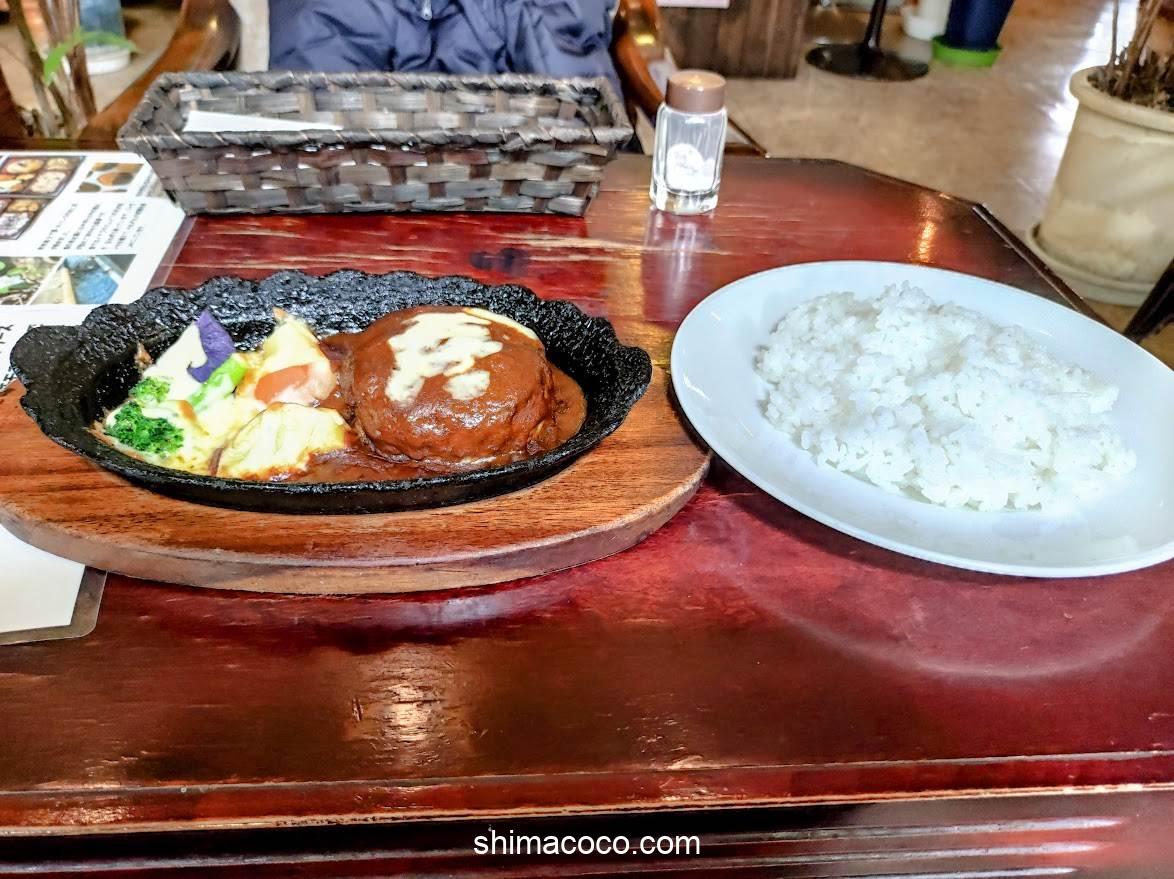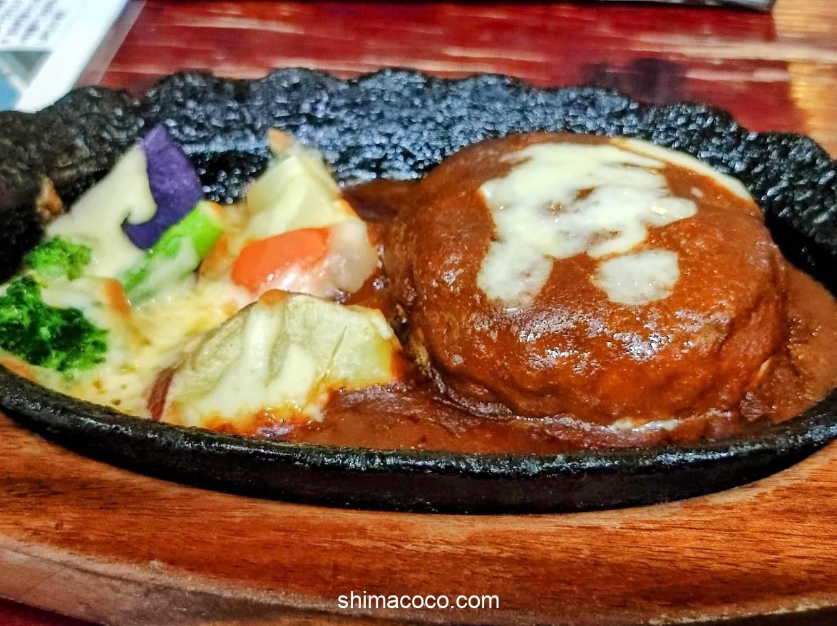 デミグラスハンバーグは熱々の鉄板で提供されます。