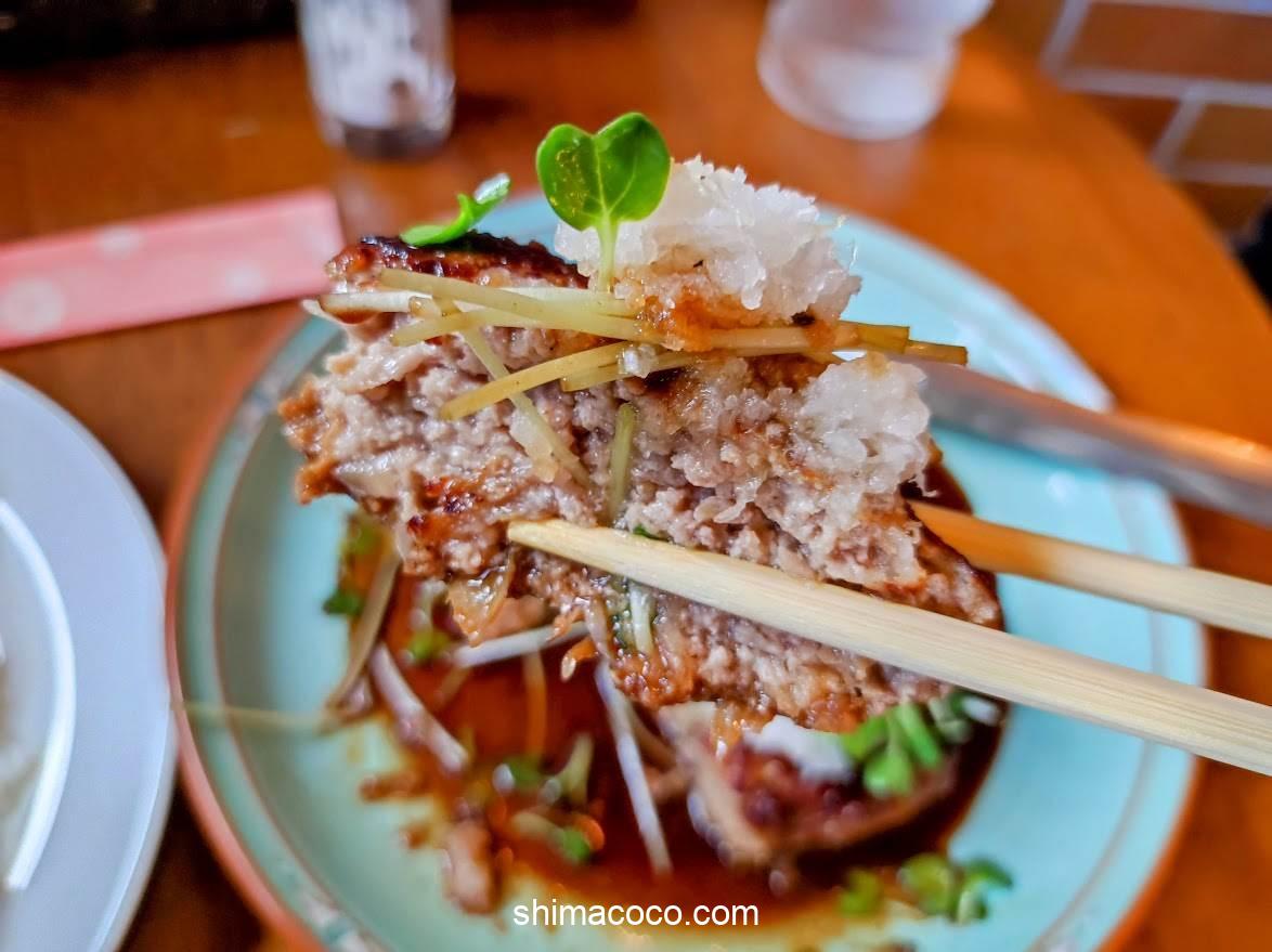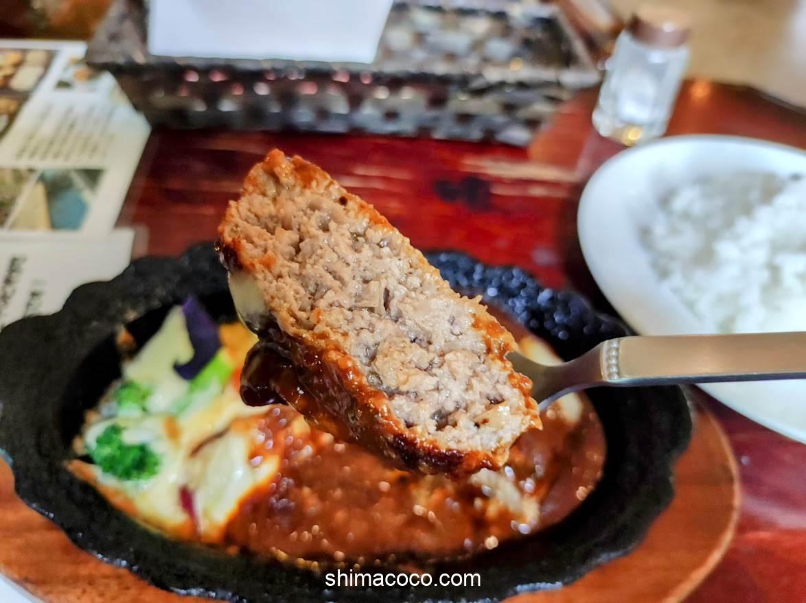 ハンバーグを自分好みのサイズにカットして豪快に食べます(とっても幸せ)。