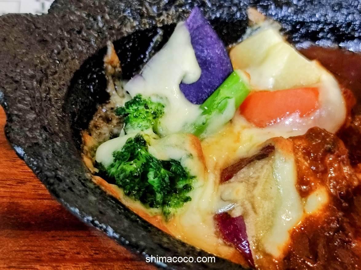 つけ合わせの温野菜には熱々とろとろのチーズがかかっています。