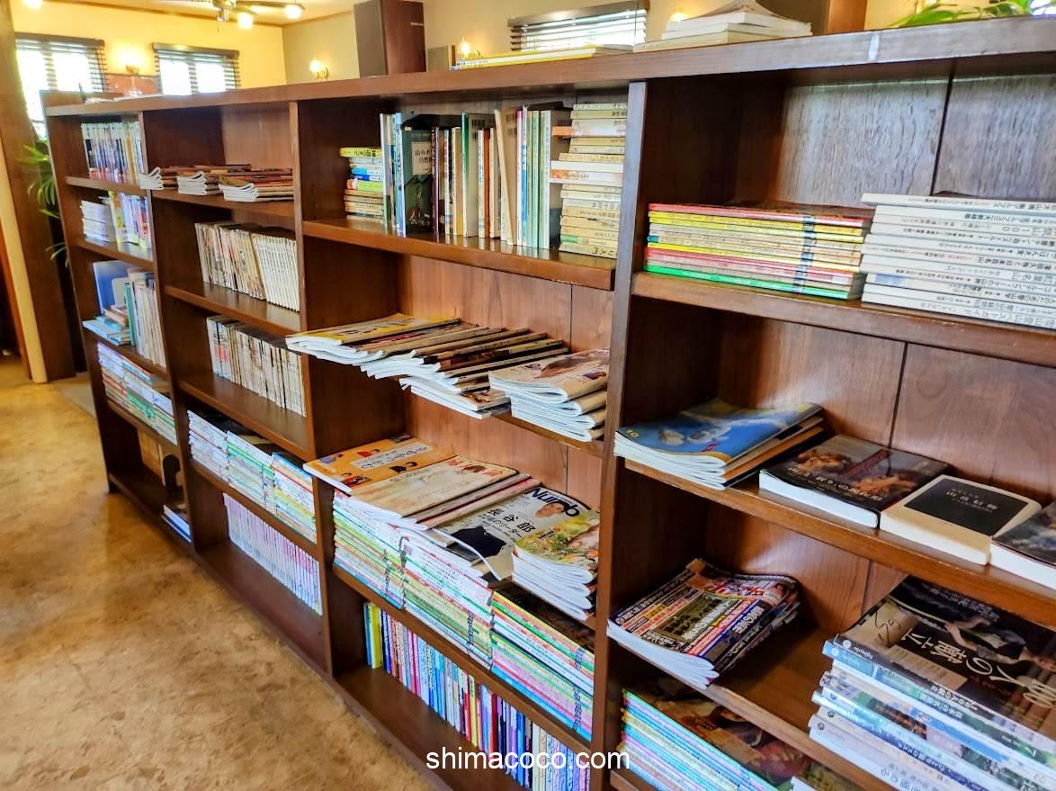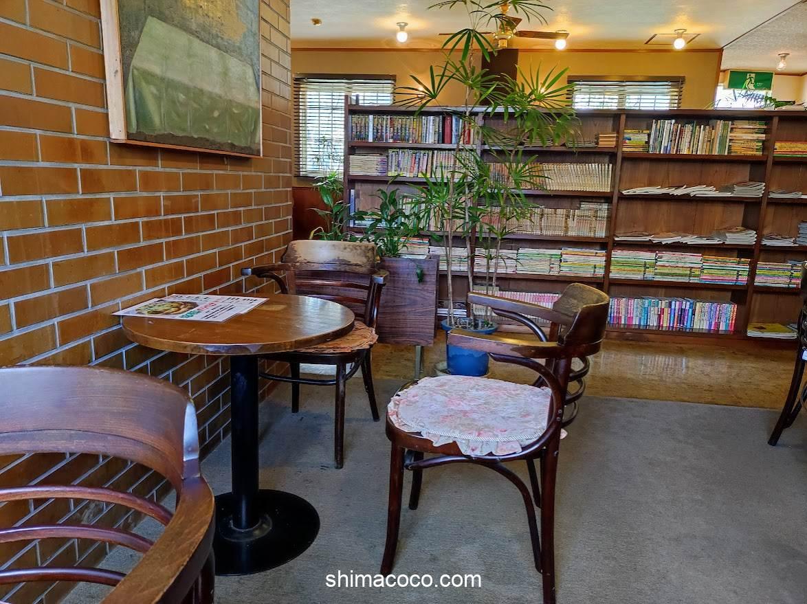 通路とテーブル席の仕切りを兼ねた大きな本棚があります。