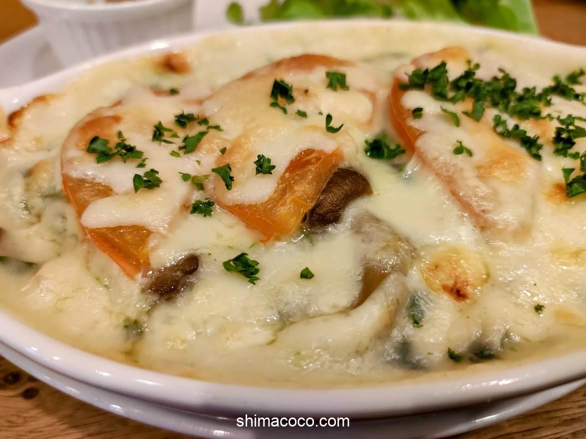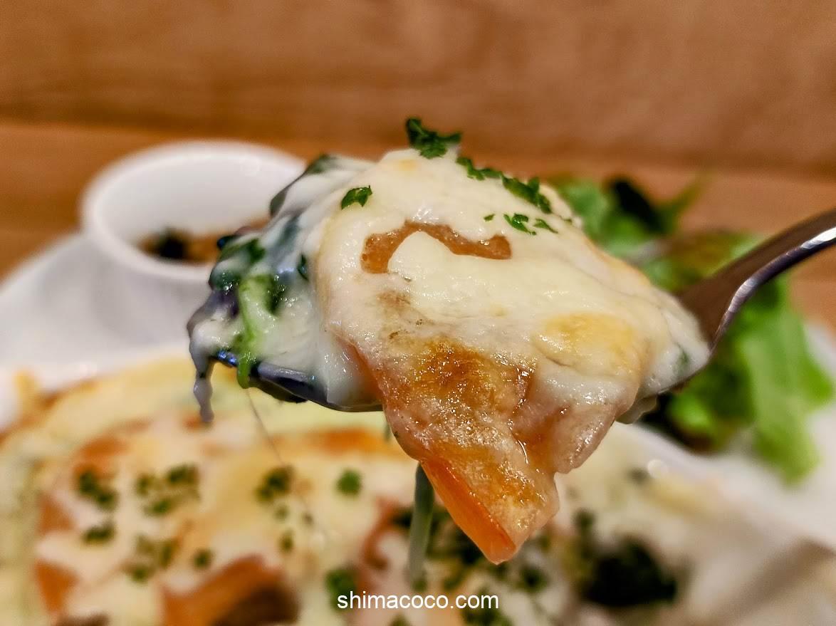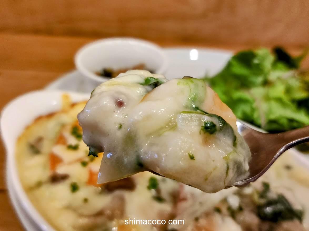 「エビ」や「きのこ」がゴロゴロ入っていて、いろいろな具材の旨味がホワイトソースに溶け込んでいます。