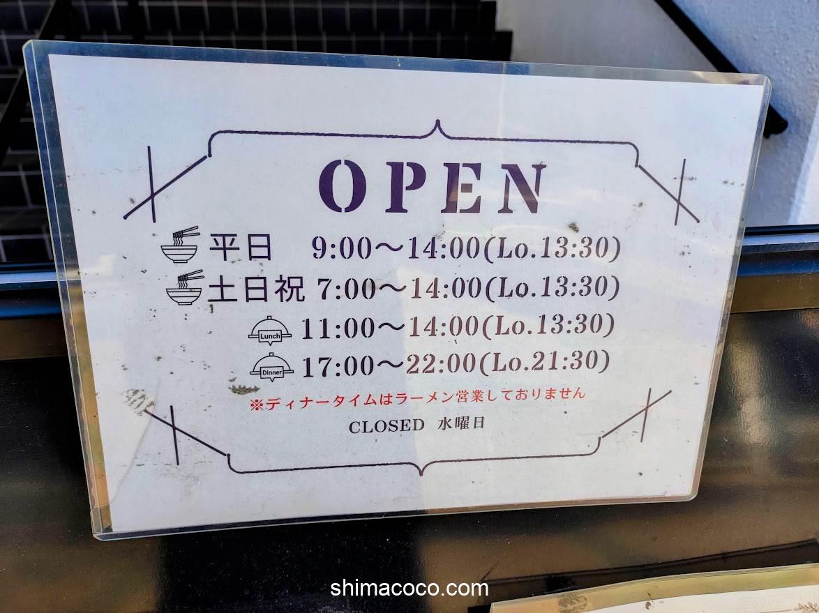 | 営業時間 | ランチ|11:00~14:00(Lo.13:30) ディナー|17:00~22:00(Lo.21:30) 朝ラー|平日9:00~・土日祝7:00~ |