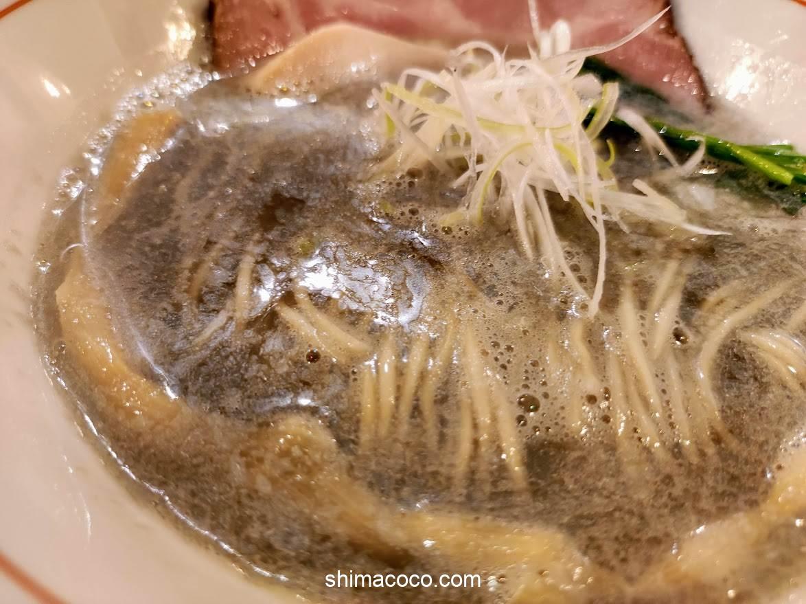 澄んだスープに香味オイルが加わって旨味とコクがプラス