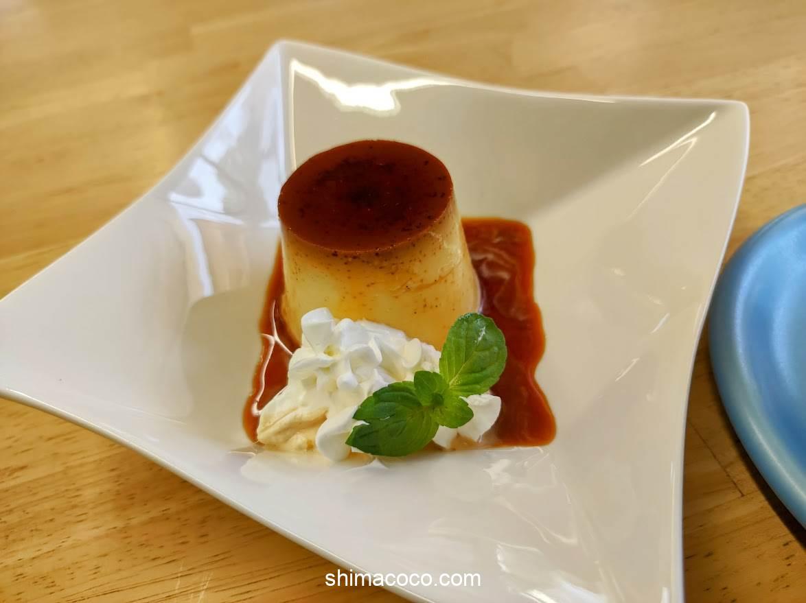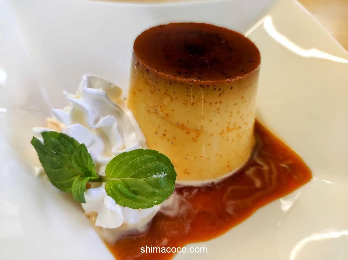 生クリームとミントの葉を添えたプリンは見た目も楽しめるスイーツ。