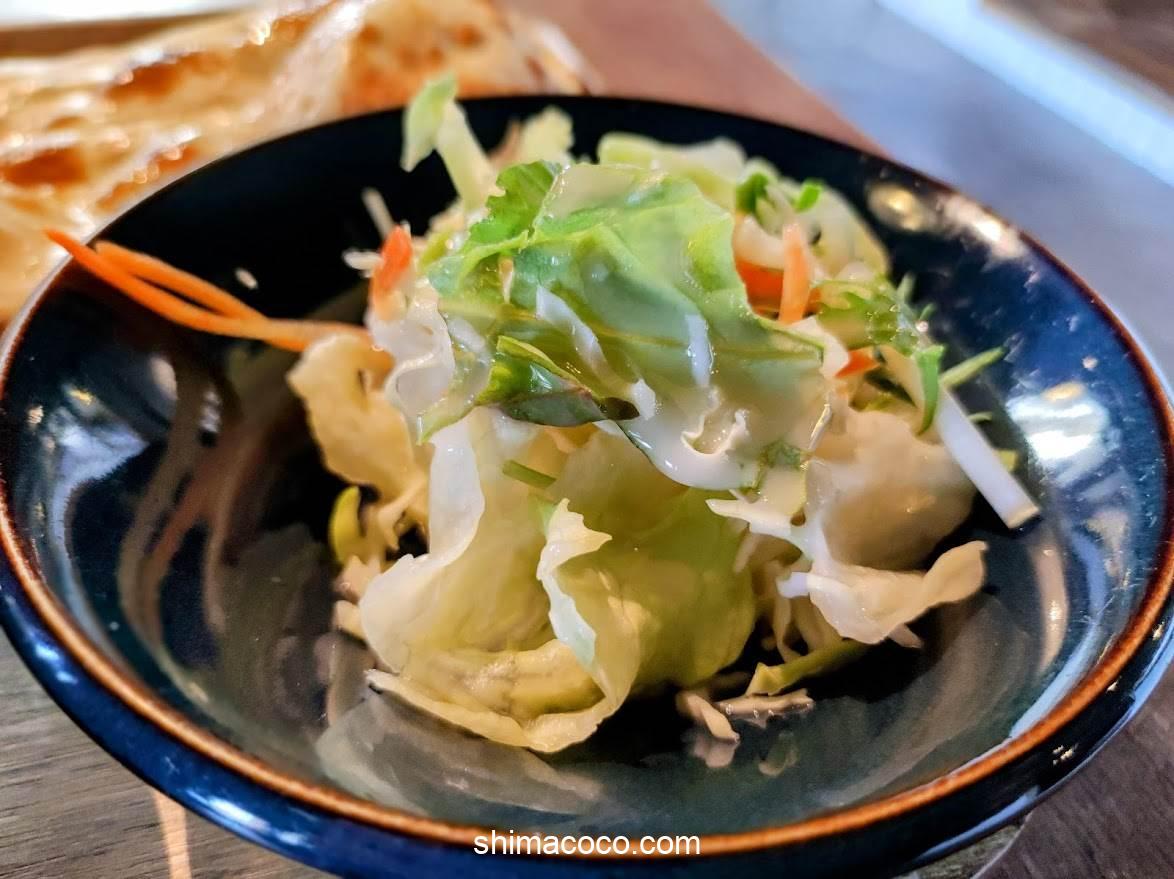 インド料理屋さんでよく見かけるオレンジ色のドレッシングではなく、白いドレッシングがかけられています。