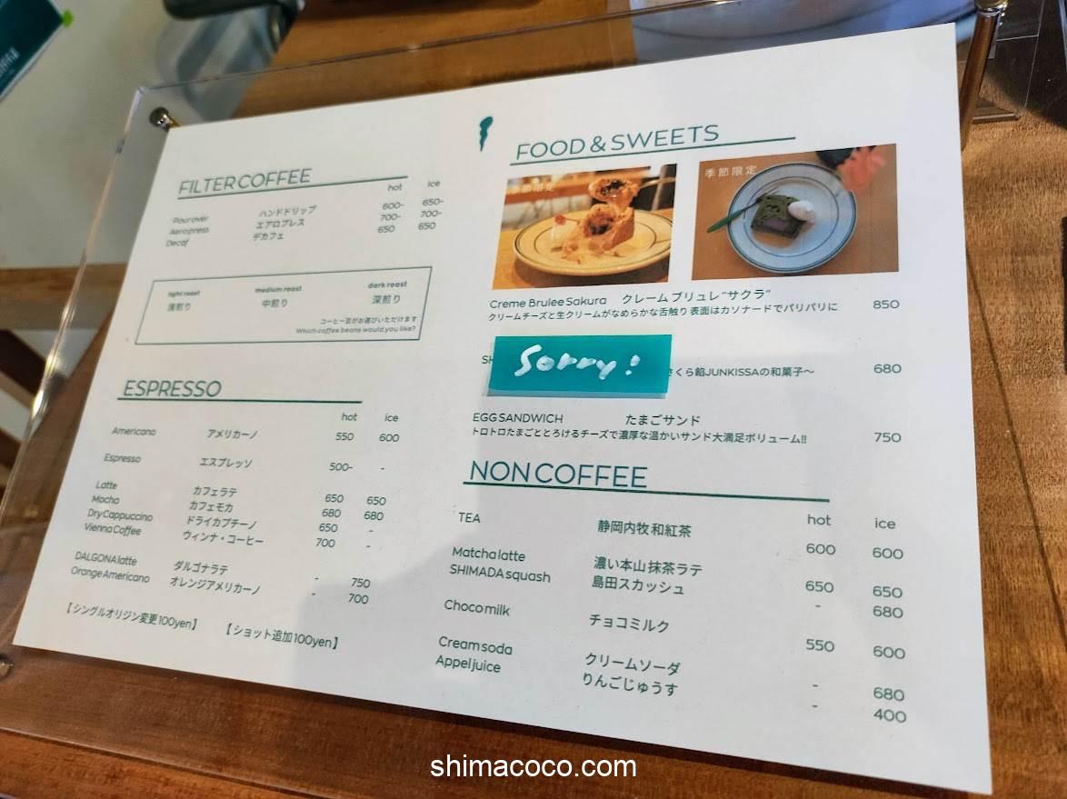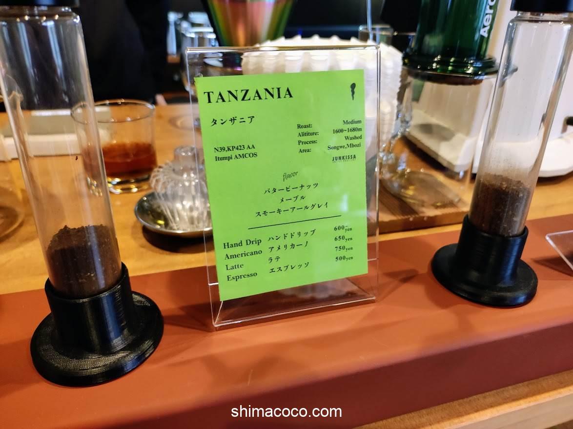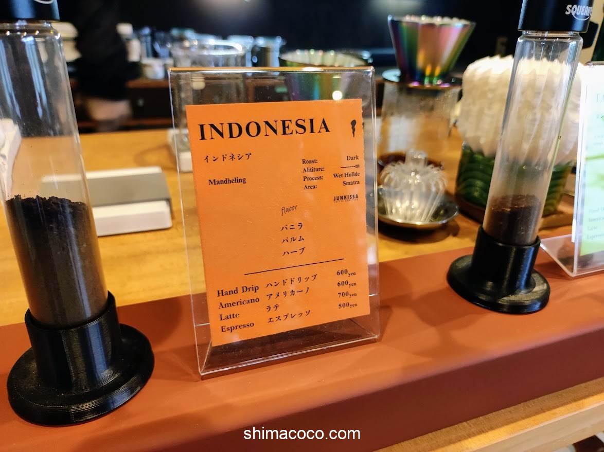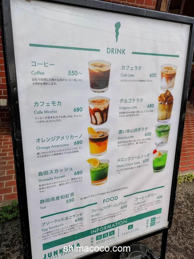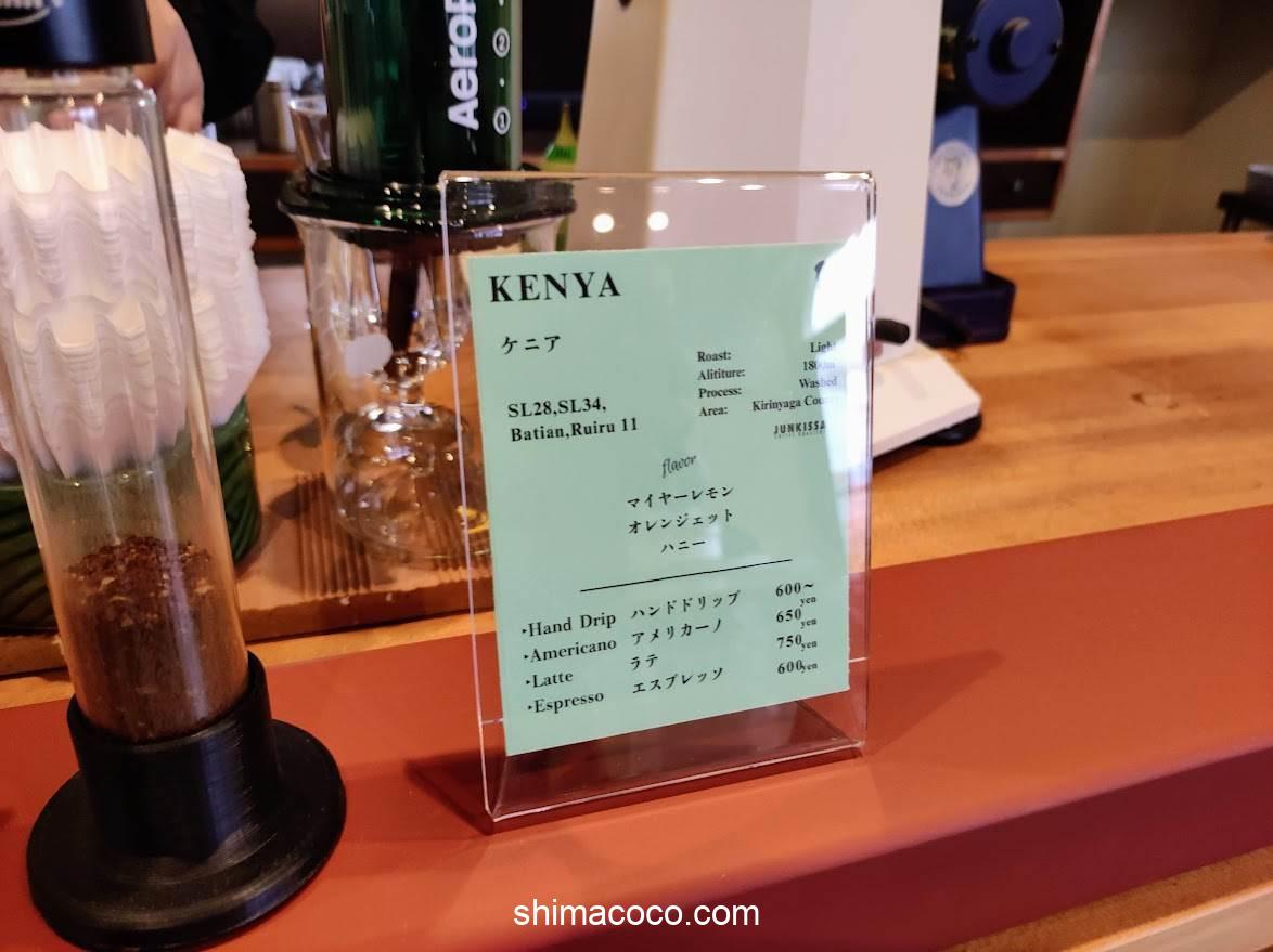 JUNKISSA COFFEE ROASTERY(ジュンキッサ コーヒー ロースタリー)のメニューをご紹介します。