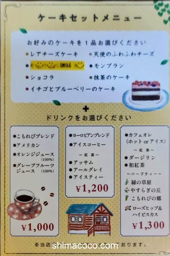 今回はお昼を食べた後だったので「ケーキセット」を注文しました。