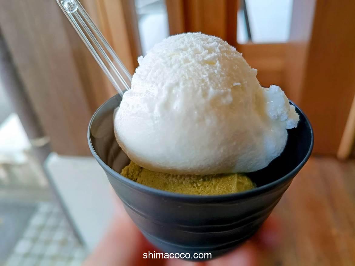 抹茶の「NO.5」は苦味がほどよく濃厚な味わい(ななやの抹茶ジェラートは何番を選んでも美味しい)。