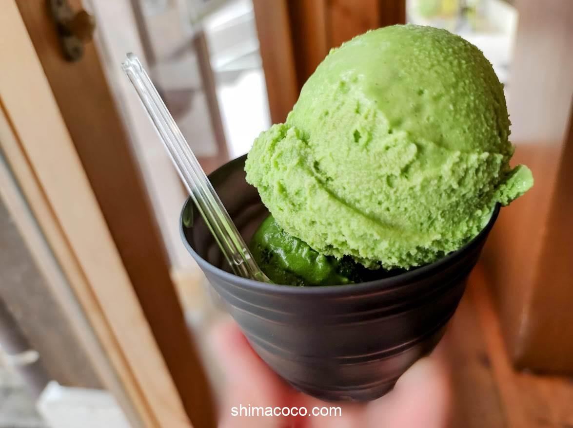 抹茶の「NO.5」は苦味がほどよく濃厚な味わい(ななやの抹茶ジェラートは何番を選んでも美味しい)。