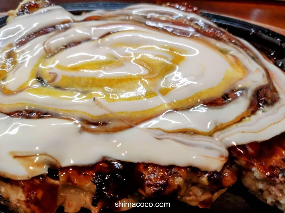 焼き上がったお好み焼きの上にたっぷりとかけられている「からしマヨネーズ」が特徴的。