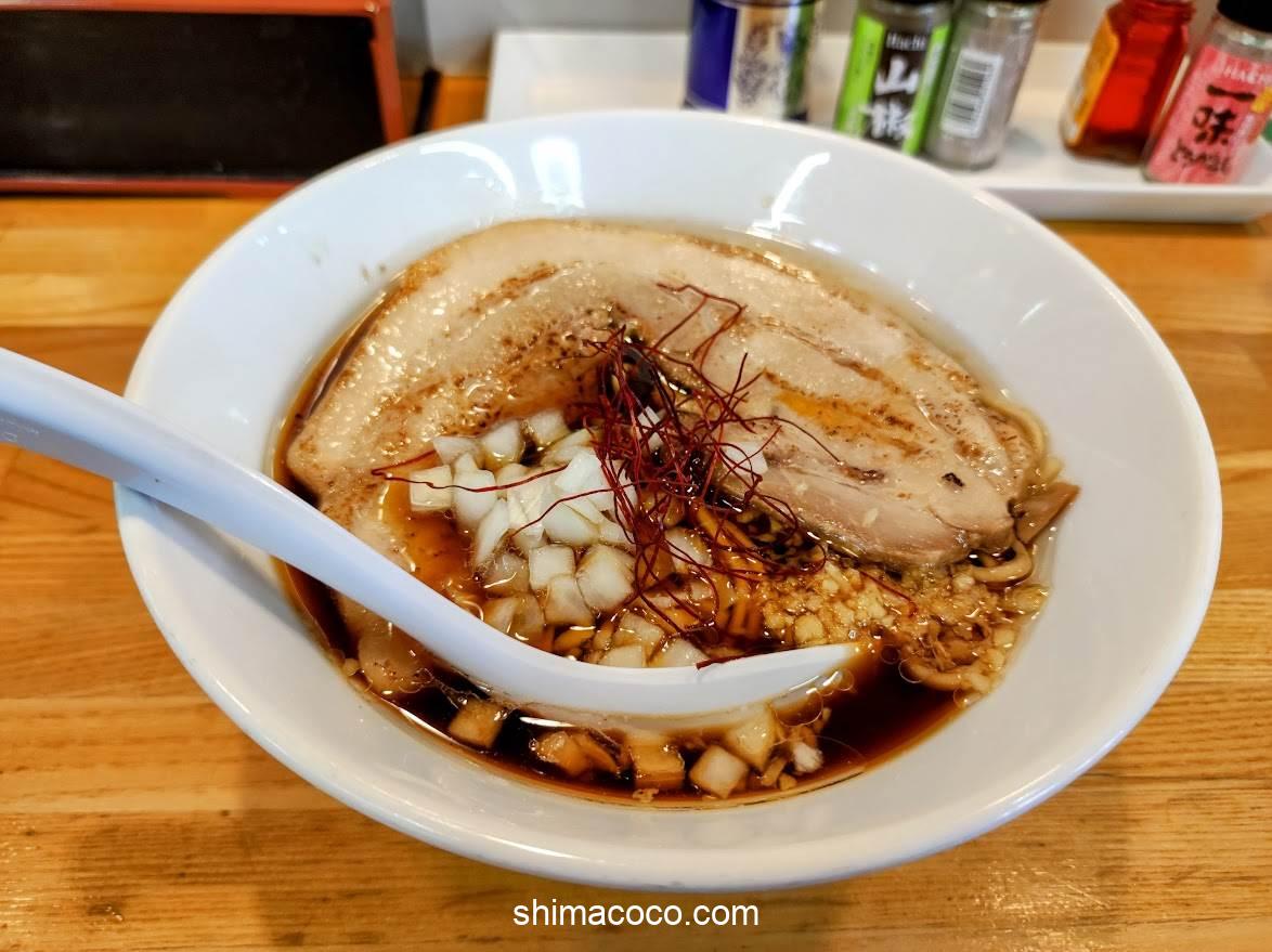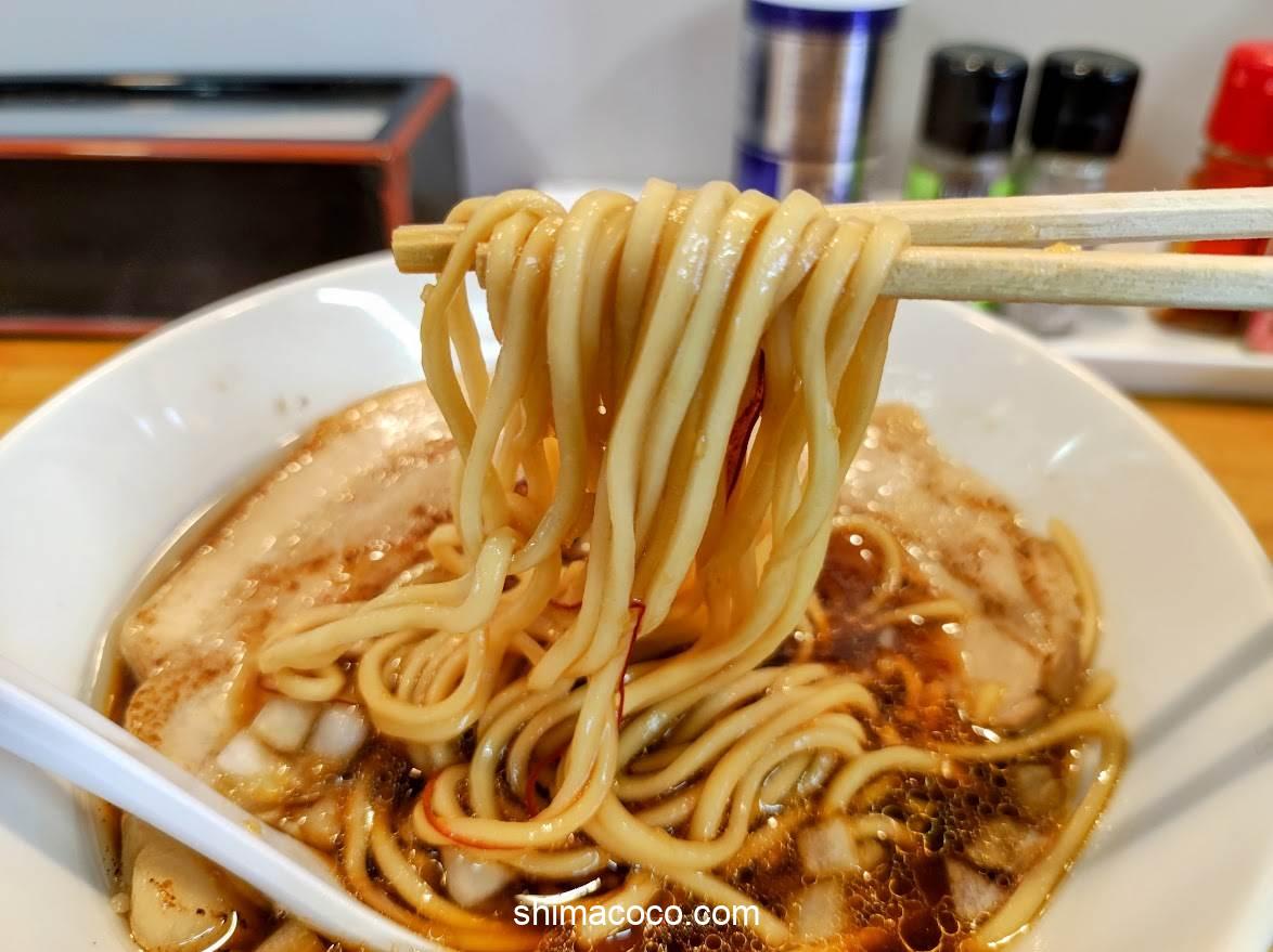醤油がしっかり効いていてやや濃いめの味わいのスープ。