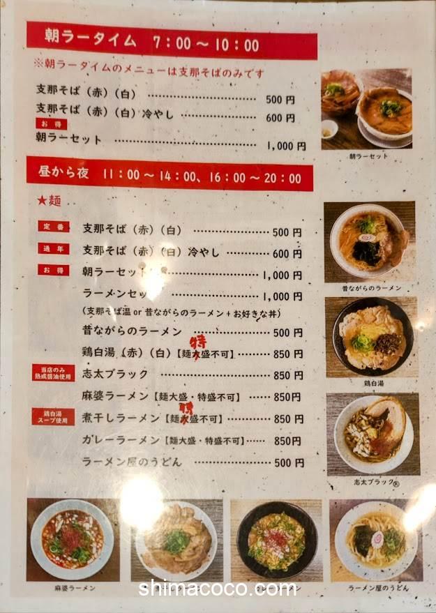 500円ラーメンは「支那そば赤・白、昔ながらのラーメン」の3種類