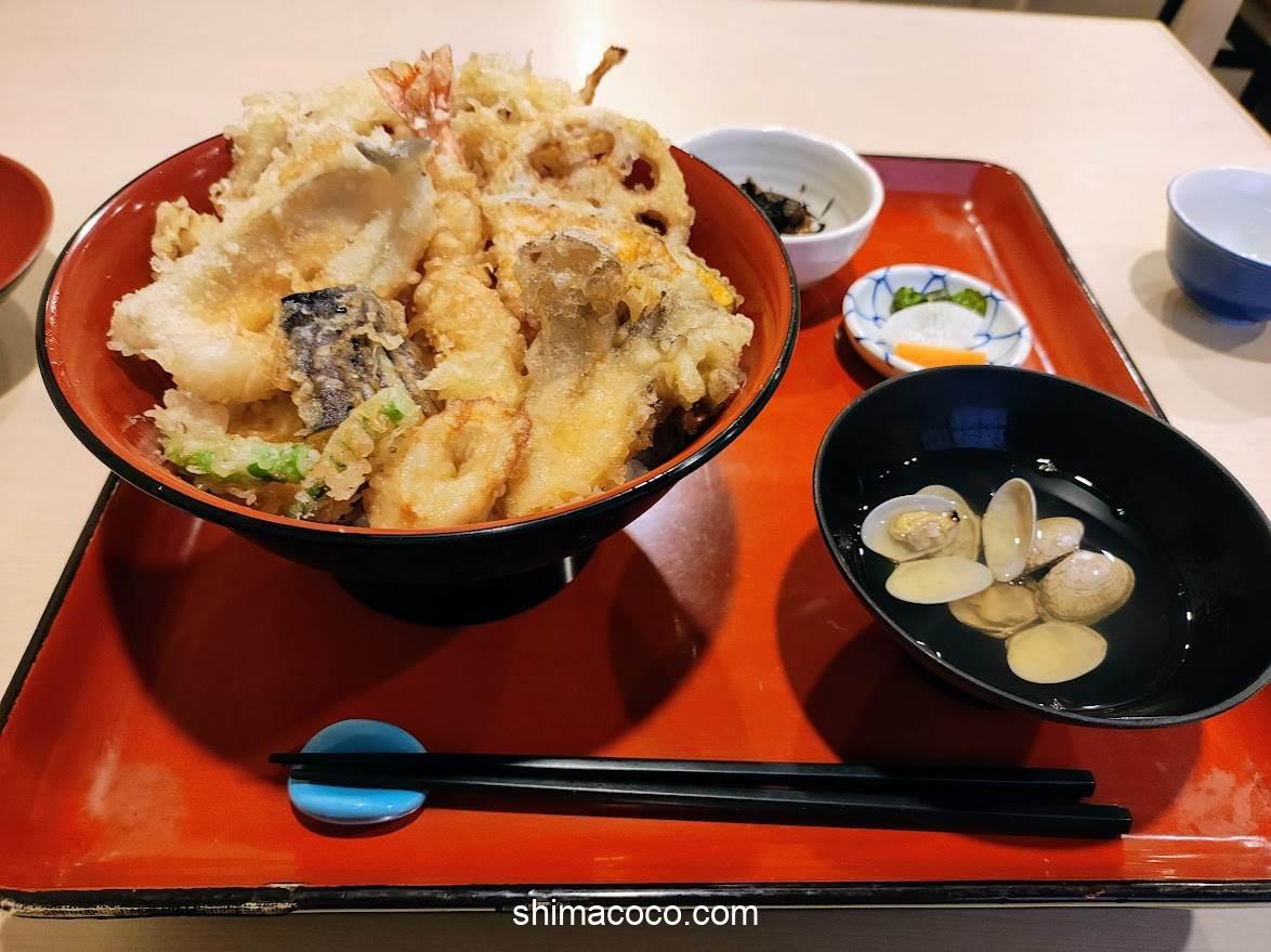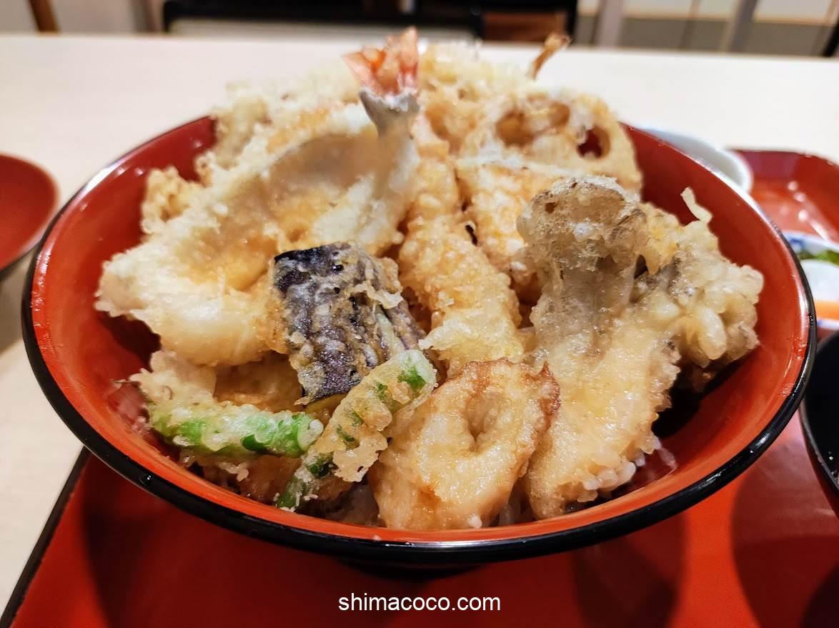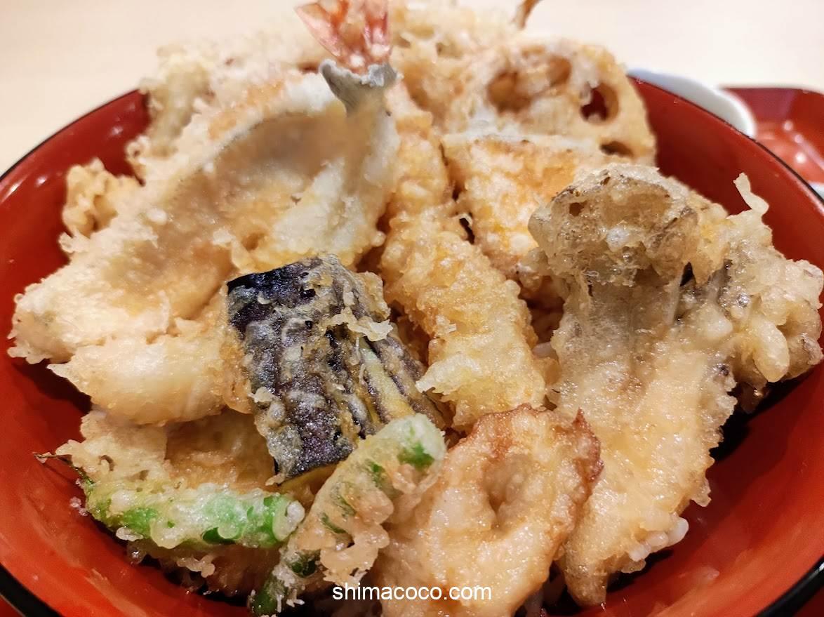 ご飯が見えないほどたっぷりの天ぷらが乗っている