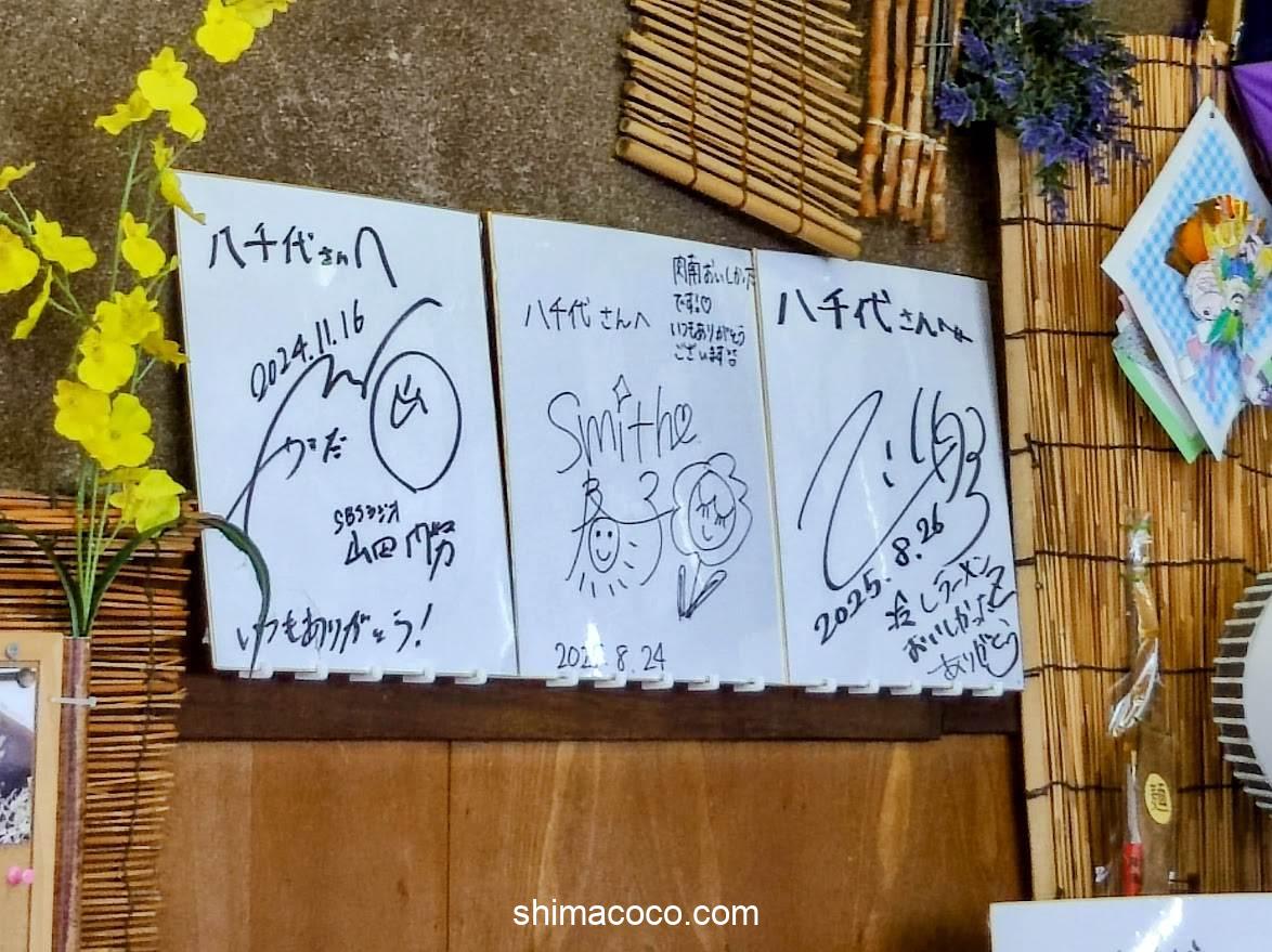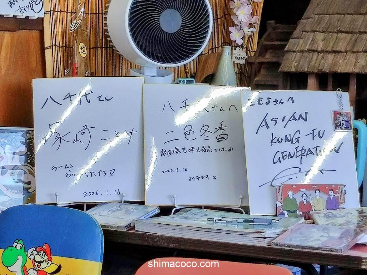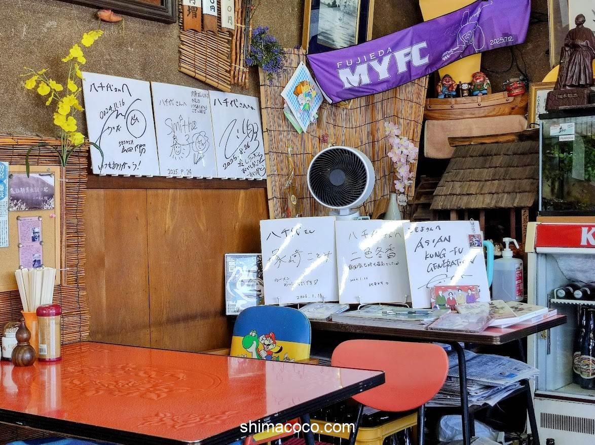 店内の奥(テレビの下あたり)にはサインがたくさん飾られています。